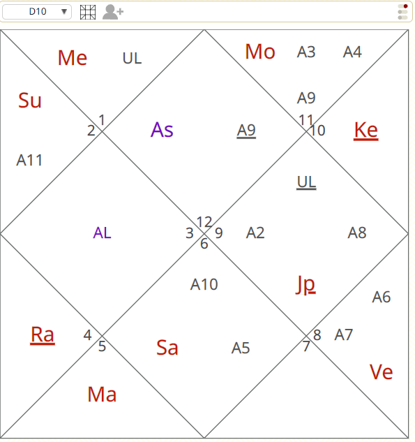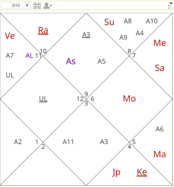 In the Daśāmśa, the artha trikona [2H, 6H, 10H] is seen to determine career/profession & we see a Hamsa Mahāpuruśa Jupiter in Sagittarius 10H & Mercury & Mars in the 2H & 6H respectively forming that perfect combination for a lawyer.