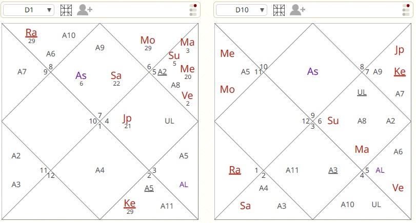 Śukra, the 10L of her D1 is in the 3rd House of her D10. Brhaspati, the 10L of her D10 is also in the 3rd House of her D10 i.e., the 10L of D1 & 10L of D10 are together in the 3H of D10. The Kāma Trikona representing desires & sexuality governs career in acting, entertainment, films etc. Hence, Actors generally have the 10L of D1 placed in the Kāma Trikona of the D10 chart and even the 10L of D10 is generally placed in the Kāma Trikona itself of the D10. Deepika made her debut with the film Om Shanti Om in Brhaspati mahādaśā Śukra antar daśā. In the D10, if there is an association between the 10L of D1 & the 10L of D10 the career either gets triggered in their joint daśā or that time period is a major highlight in the career.
