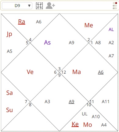 Deepika’s Ātmakāraka [Brhaspati] is in the 3rd House of Navāmśa. If Ātmakāraka is in the 3rd House of Navāmśa person is successful in his undertakings, enterprises and is friends with powerful people. This is obvious given her own success in her career.