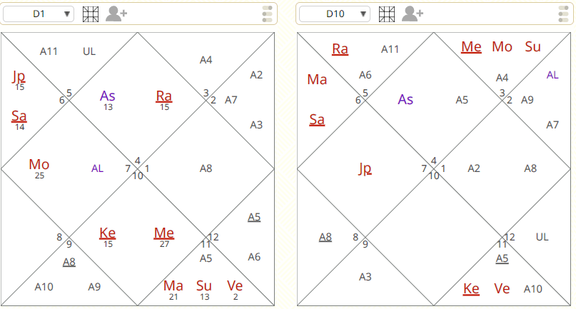 Śukra is the 10L in both D1 & D10 and is placed in the 7H of D10.
