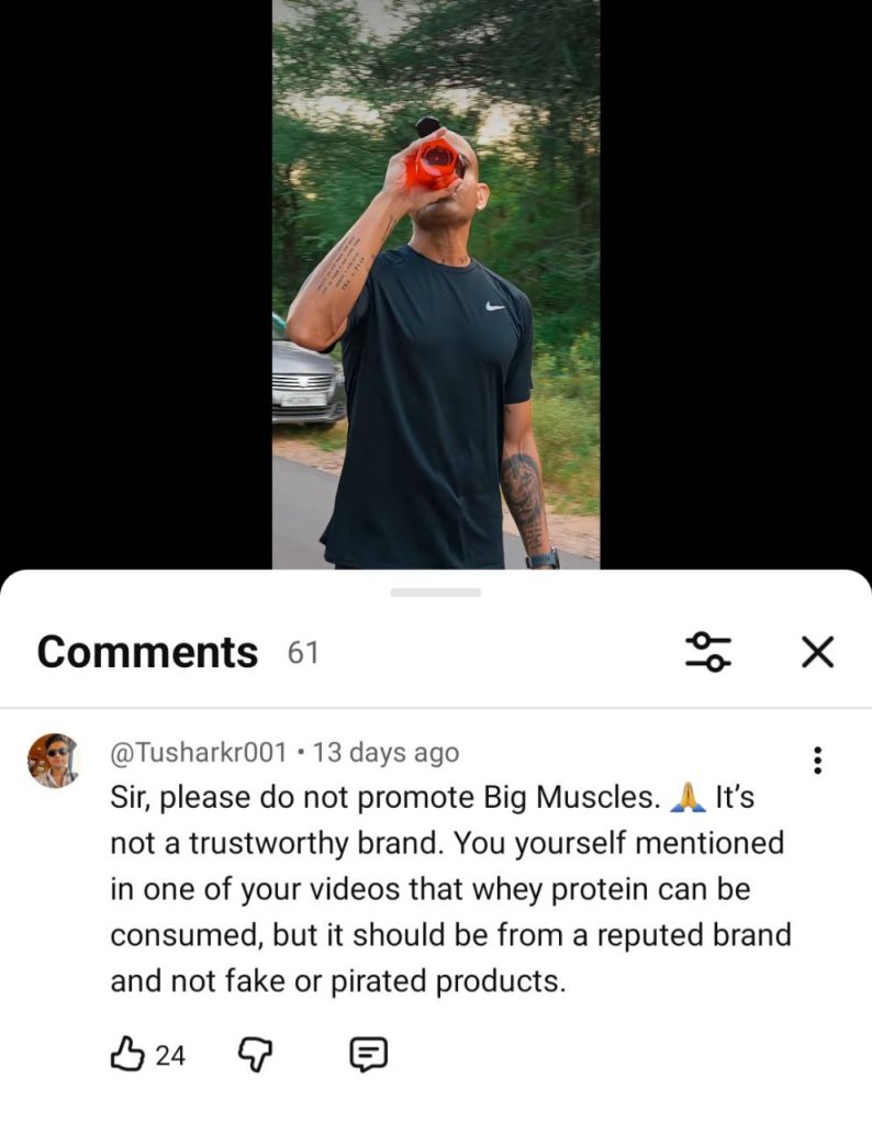 Col. Sāhab had recently promoted a Whey Protein Brand on his YouTube channel & as I opened the comments section, it was literally flooded with people mentioning that although they have unmatched respect for what Col. Sāhab has done for the country but he should be careful in deciding which brands & products to promote as it seemed from the comments & then later from my google search that the Brand (promoted by Col. Sāhab) had been found guilty by a consumer commission in July, 2024 of false claims about the ingredients in their protein powder.